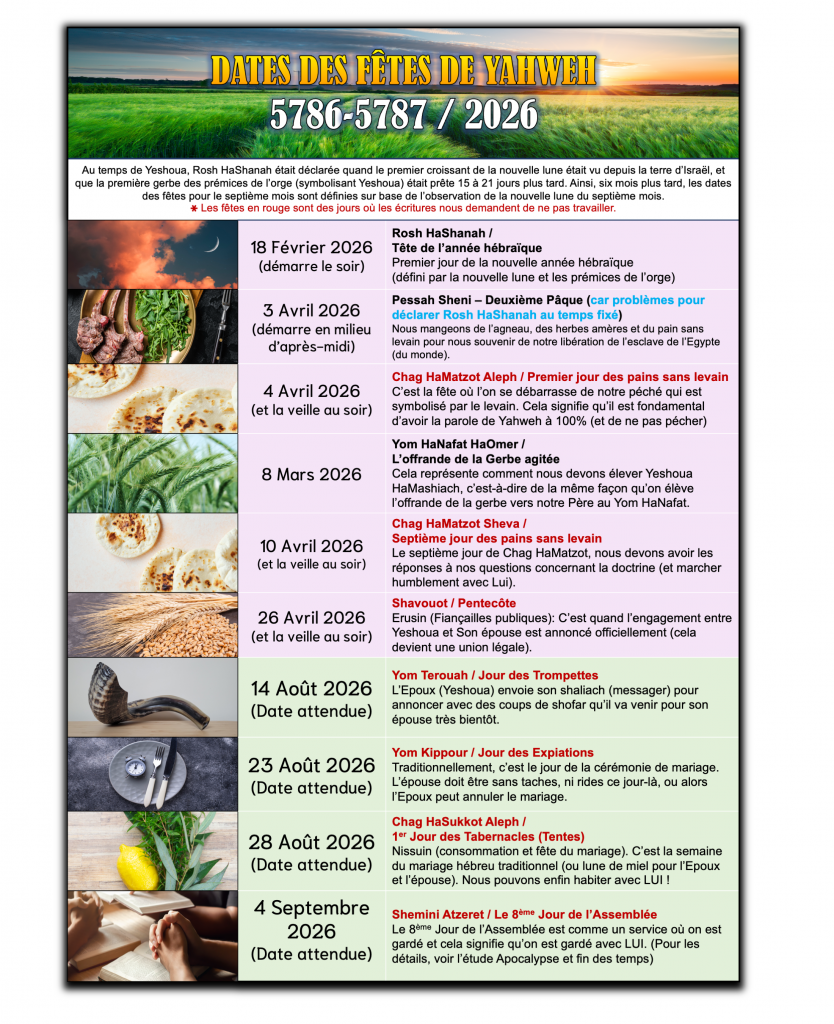 Comme tous les ans, à la période du Nouvel-an du monde, certaines personnes me demandent le calendrier des fêtes bibliques à venir. Il y a quelques jours par exemple j’ai reçu cet email : Bonjour frère Benjamin, nous sommes au Cameroun en Afrique, pouvez vous nous donner le calendrier des fêtes sacrées de cette année…